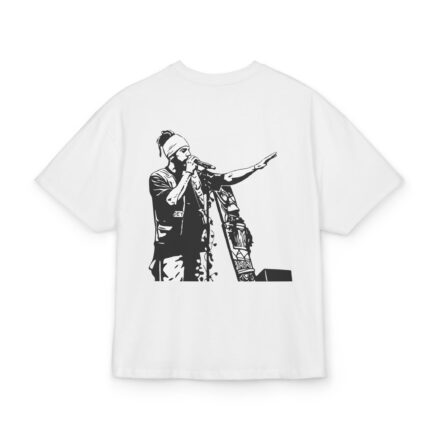 Camiseta oversize – Retrato monocromo del cantante en el escenario impreso en la espalda